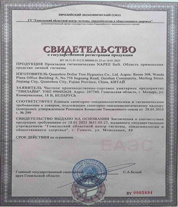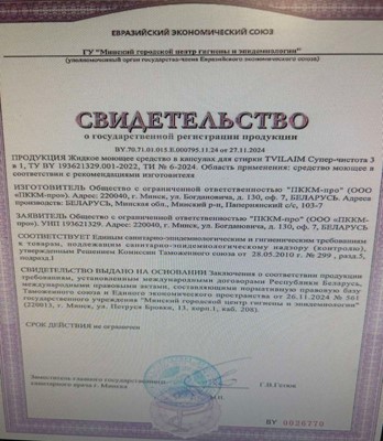 Настоящее удостоверение выдано ЧПТУП "Твилайм", и является подтверждением того, что Министерством здравоохранения Республики Беларусь зарегистрированы изделия санитарно-гигиенического персонала, а именно: